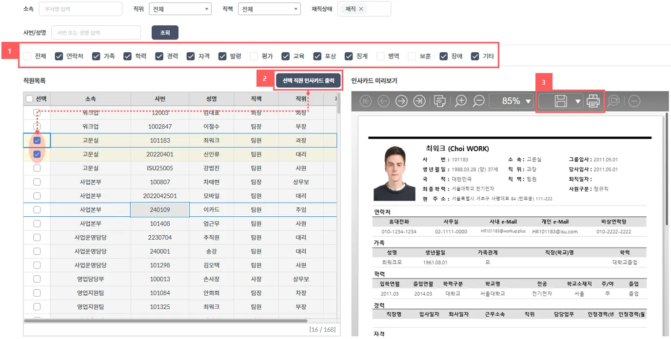 ② 인사기록카드를 조회할 직원들 선택 및 출력