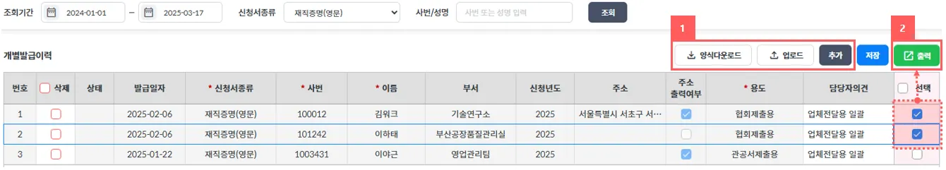 임직원들의 제증명을 일괄로 발급하기 위한 담당자용 화면입니다.