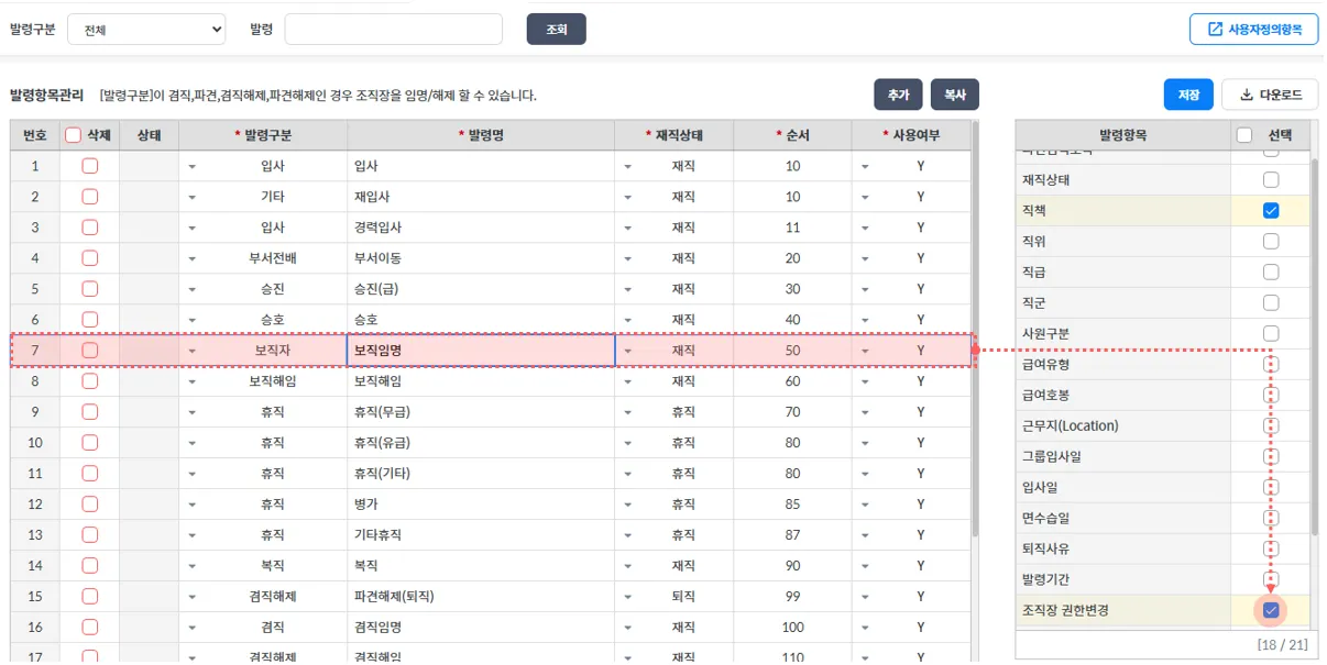 인사/조직 > 발령정보 > 발령항목관리 화면에서 발령에 ‘조직장 권한변경’을 활성화 시킨 후 해당 발령 진행시 자동으로 조직장 등록이 됩니다.
