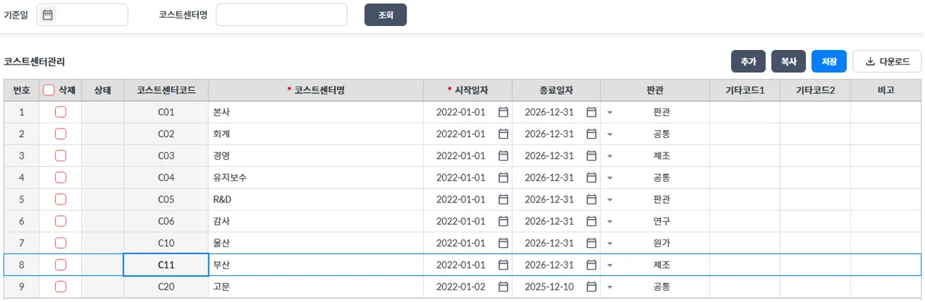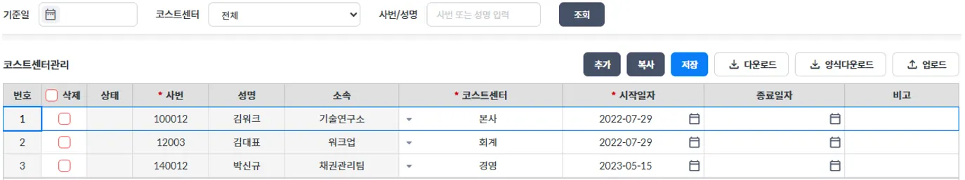 코스트센터 정보를 관리하는 화면입니다.