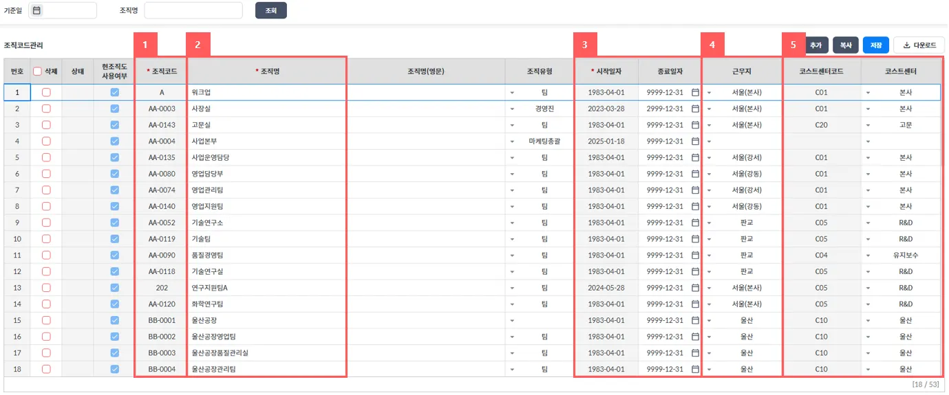 조직코드는 중복되지 않게 기입하고 혹시나 같은 코드라면 시작일자와 종료일자가 겹치지 않게 등록해 주십시오.