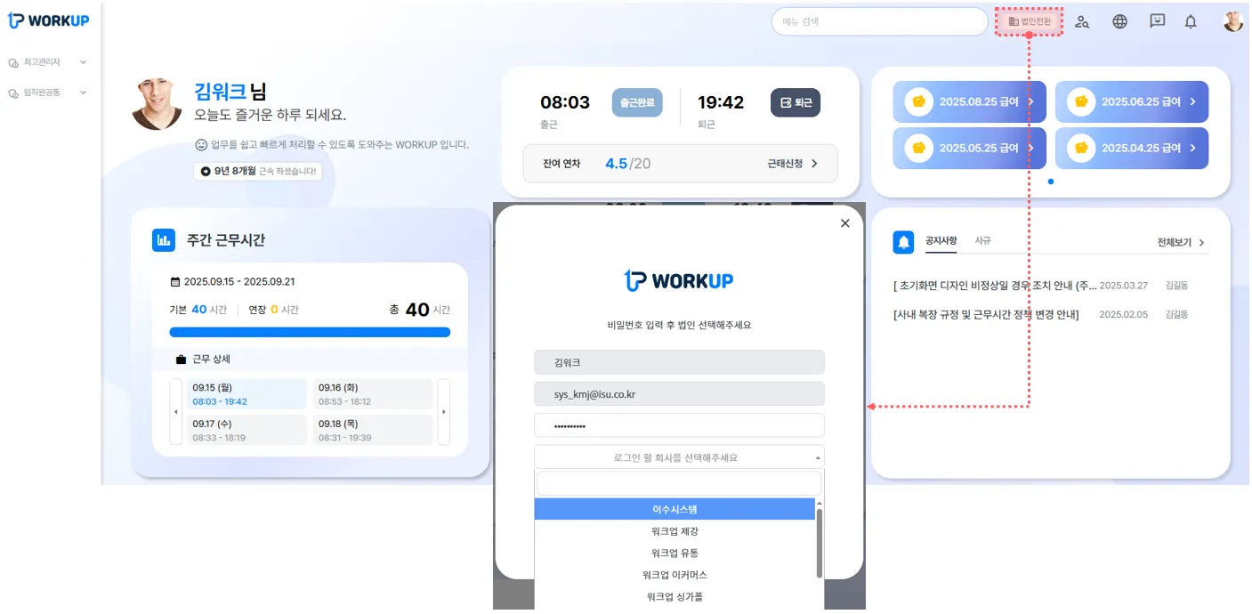 그룹사를 운영하는 관리자의 경우 법인 전환 기능을 사용할 수 있습니다.