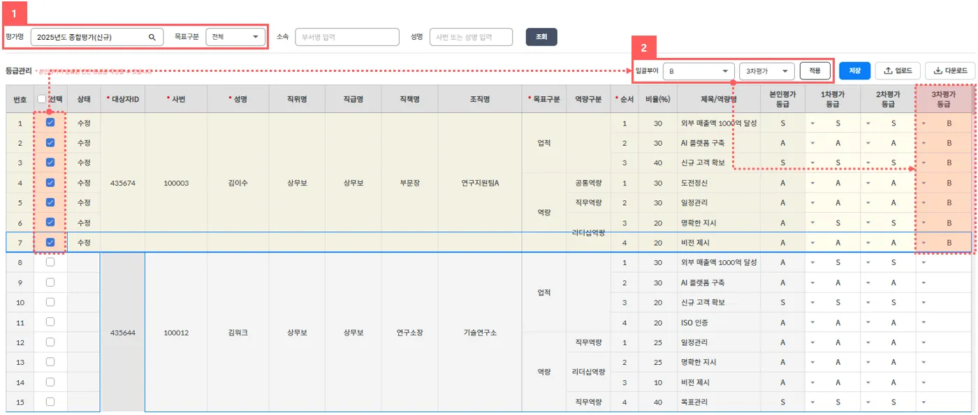 ② 선택된 대상자에 대해 일괄 부여할 평가등급과 차수 선택