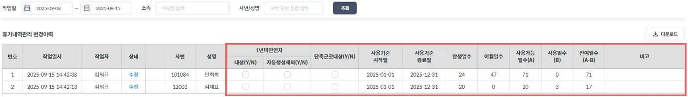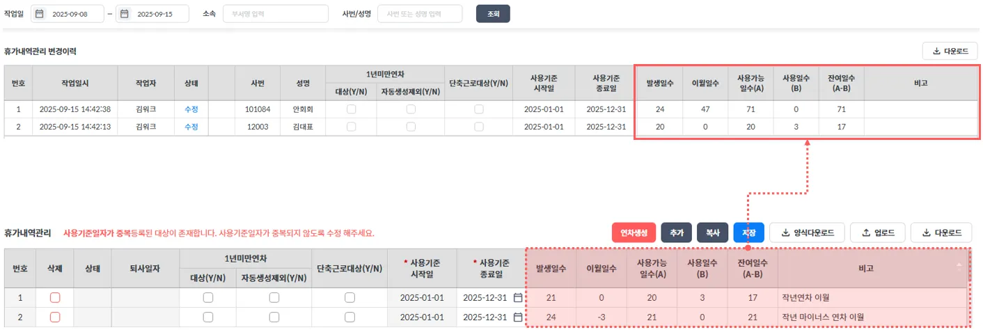 ‘변경 전’ 원본 데이터를 기록하고 있으며, 연차 신청 및 취소로 갱신되는 내역은 기존 처럼 자동 계산됩니다. (기록 X)