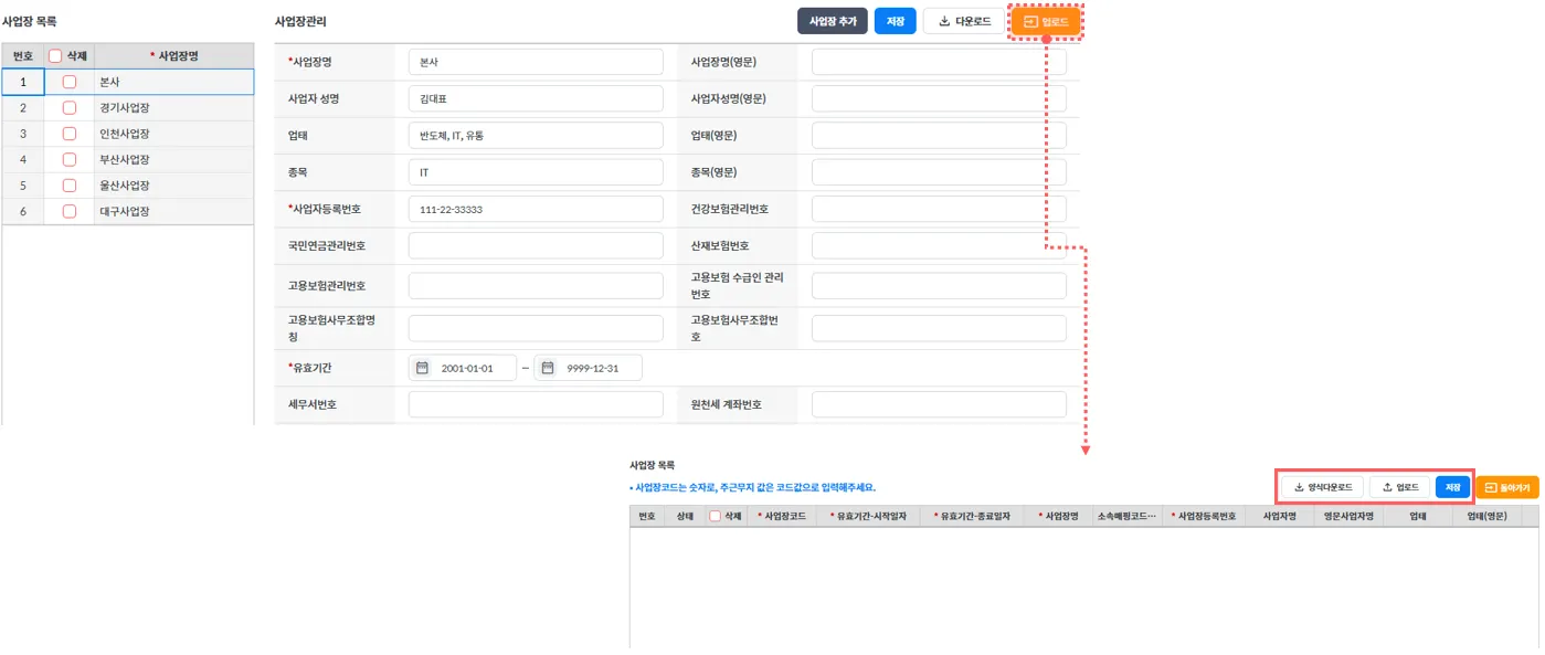 사업장 등록시 업로드 버튼을 통해 엑셀로 일괄 업로드를 하는 화면으로 전환됩니다.