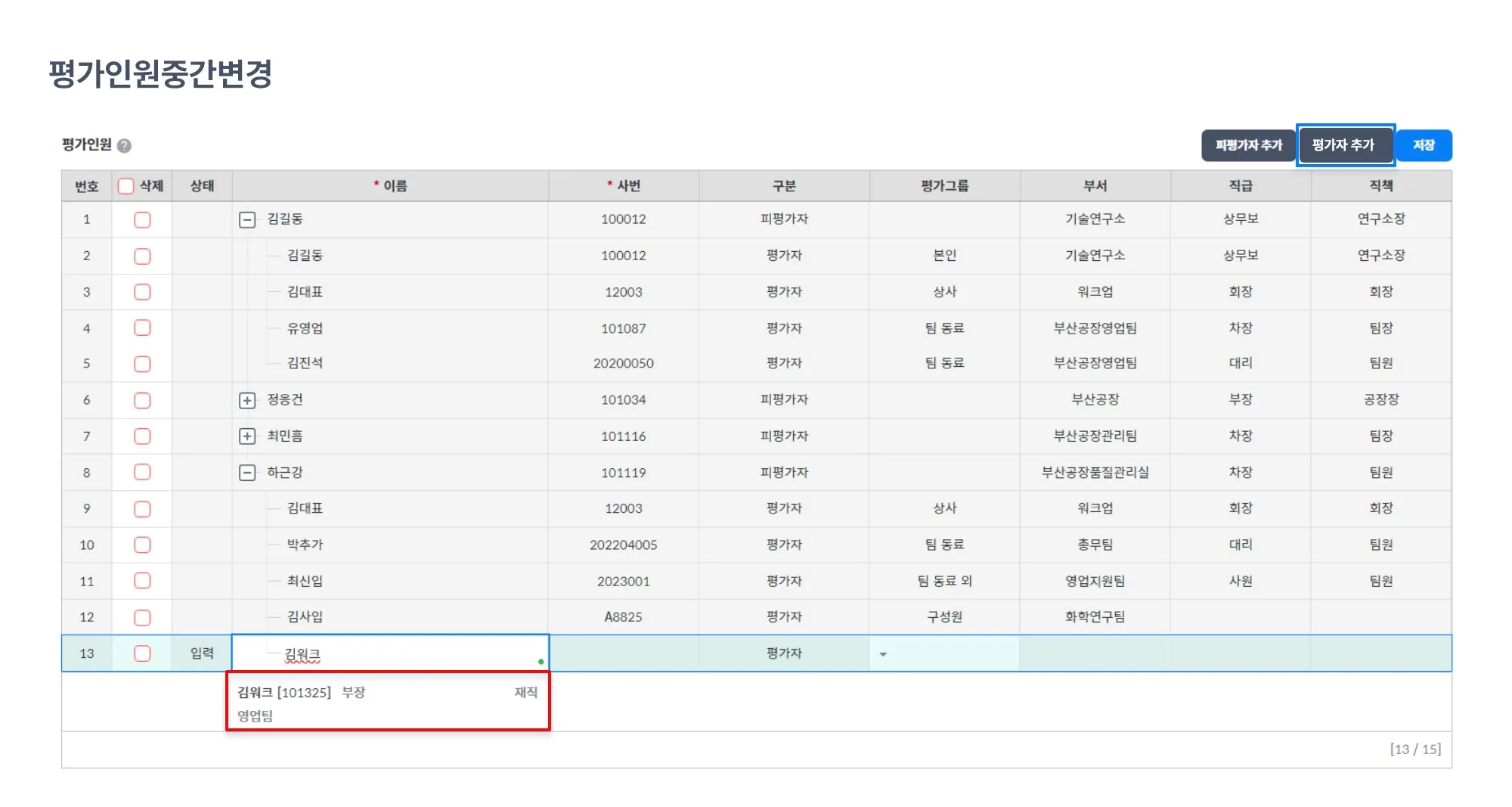 선택된 피평가자의 평가자로 대상자를 추가할 수 있습니다.