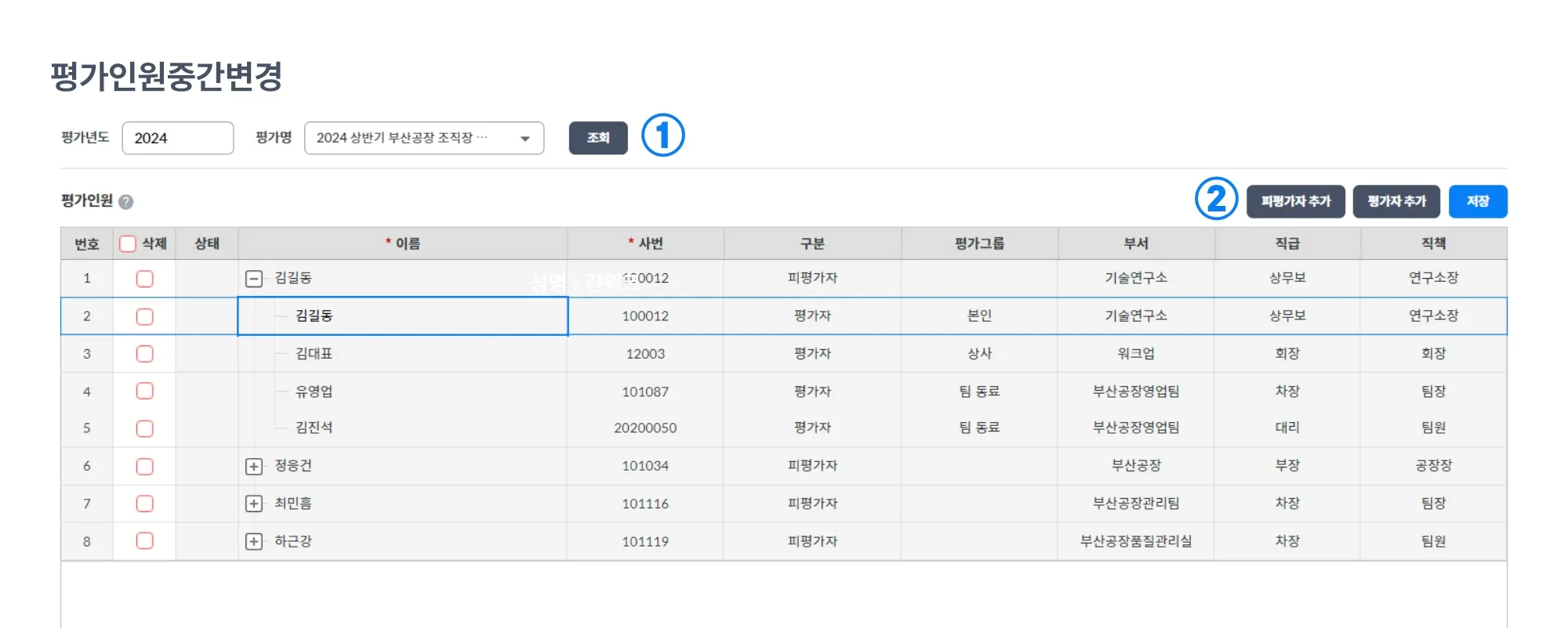 ② 피평가자, 평가자를 추가