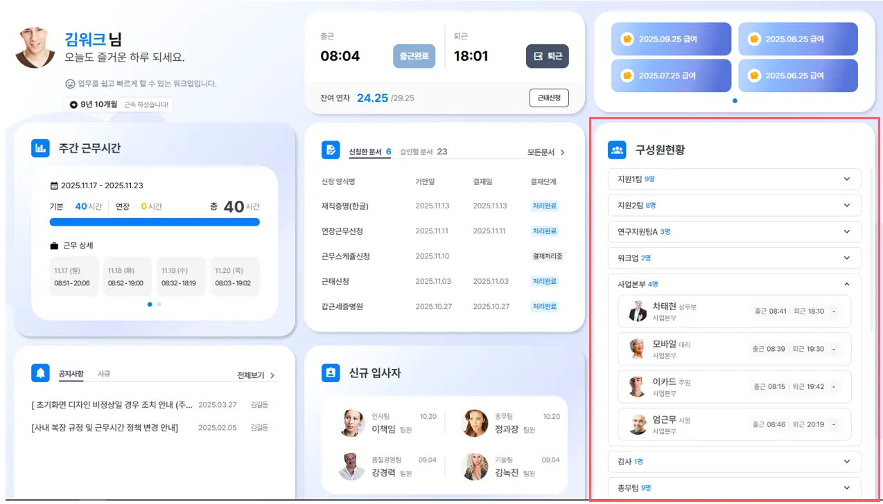 임직원들의 출퇴근 현황을 확인할 수 있는 구성원현황 위젯이 추가되었습니다.