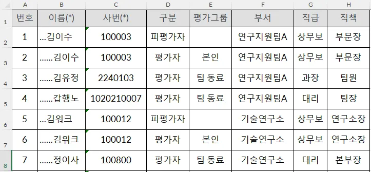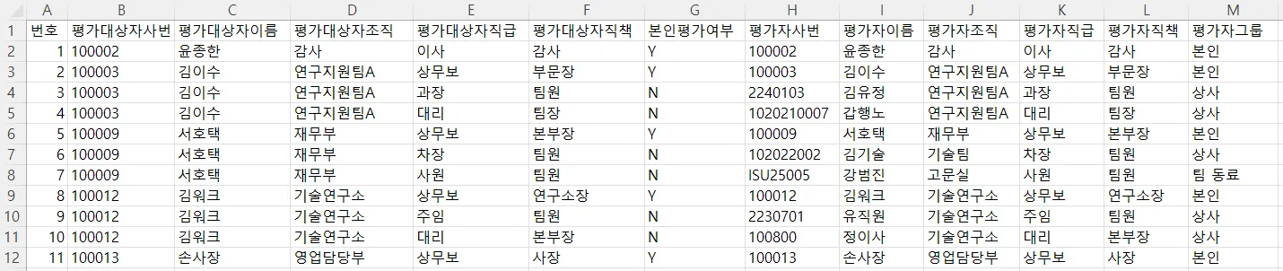 ③ 화면에 보이는 평가자/피평가자 상하위 개념의 데이터가 아닌 평가자와 피평가자를 한 줄로 정리한 데이터 양식으로 엑셀 다운로드