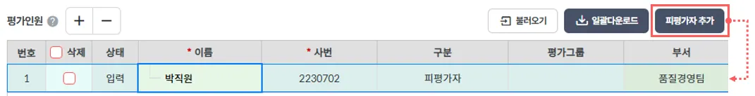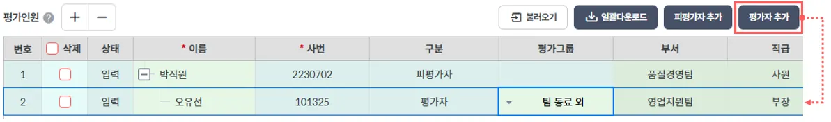 ② 조직도를 기반으로 ‘팀’ 으로 구성된 인원들에 대해 다면진단 평가자/피평가자를 일괄로 생성하는 버튼