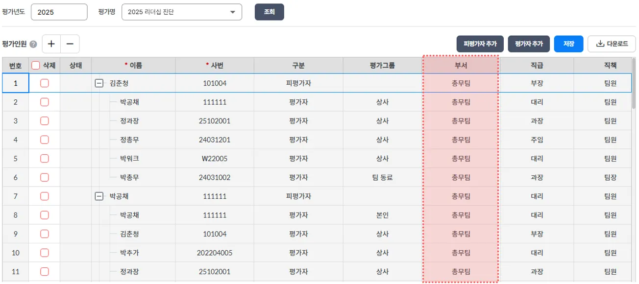 평가자/피평가자 조회 권한은 조직장 권한에 대상자만 가능