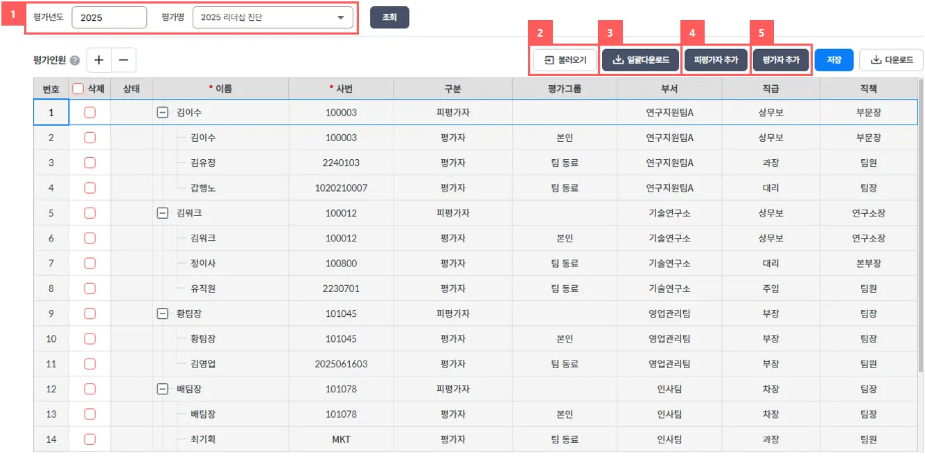 다면진단 평가자/피평가자를 직접 구성할 수 있는 조직장 화면입니다.
