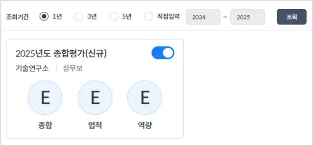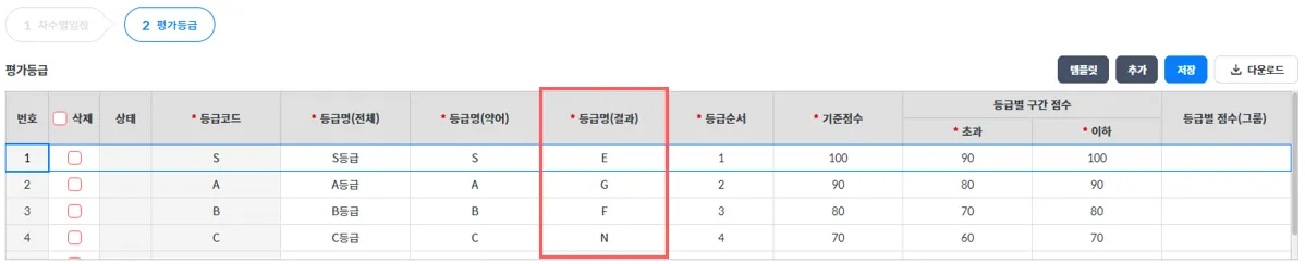 최종 평가결과를 조회하는 화면에서 등급별(결과) 컬럼에 내용으로 표기됩니다.
