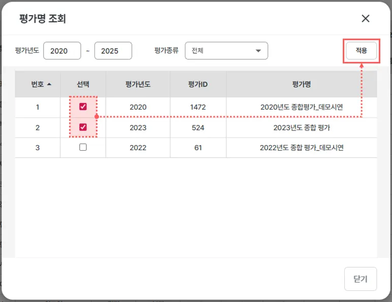 <조회할 평가명 선택 후 적용 클릭>