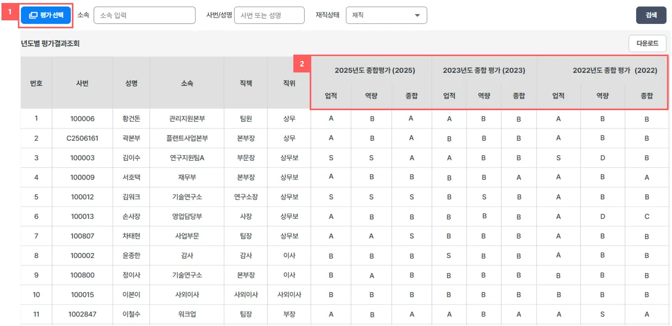 구성원들의 평가결과를 년도 별로 선택하여 한 번에 조회할 수 있는 화면이 추가되었습니다.
