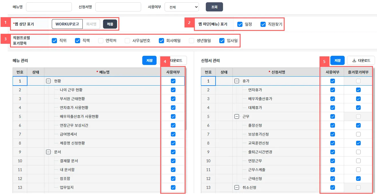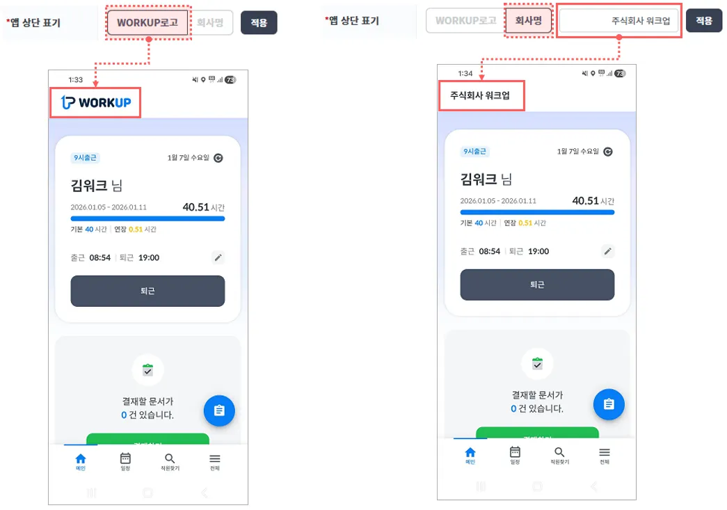① 모바일 앱 상단에 WORKUP 로고 or 회사명 표기 옵션을 선택