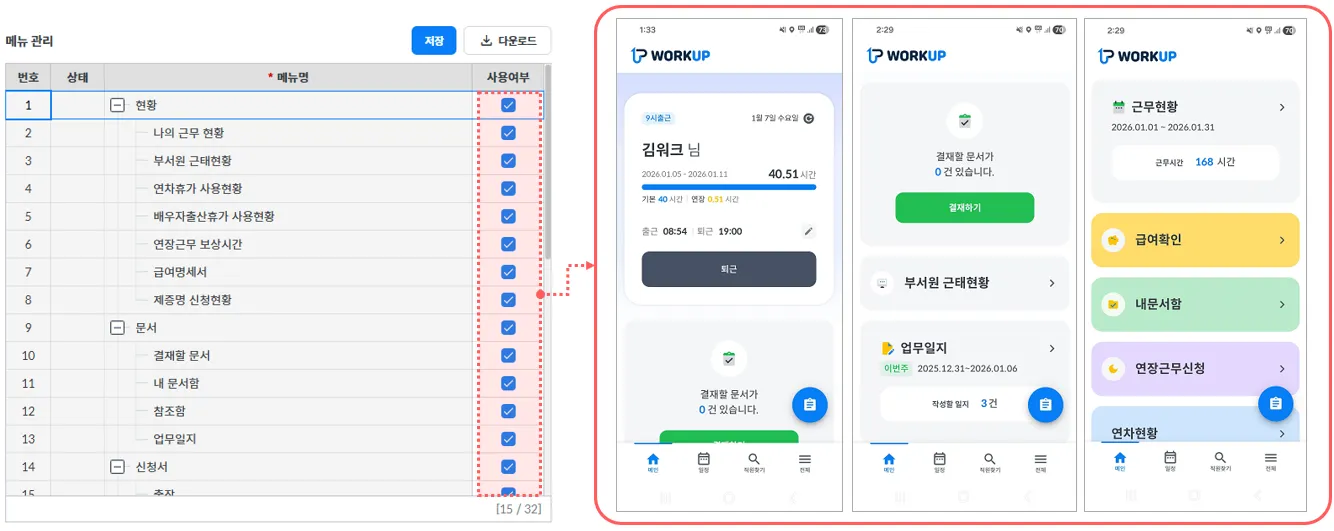 워크업 모바일 메뉴 및 화면 구성을 설정할 수 있습니다.