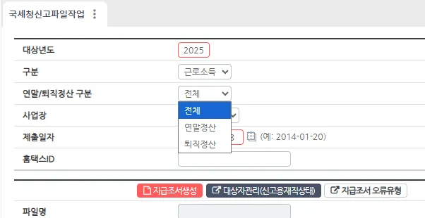 신고파일에 다 포함해도 되고, 연말정산/퇴직정산 하나만 선택해서 생성해도 됩니다.