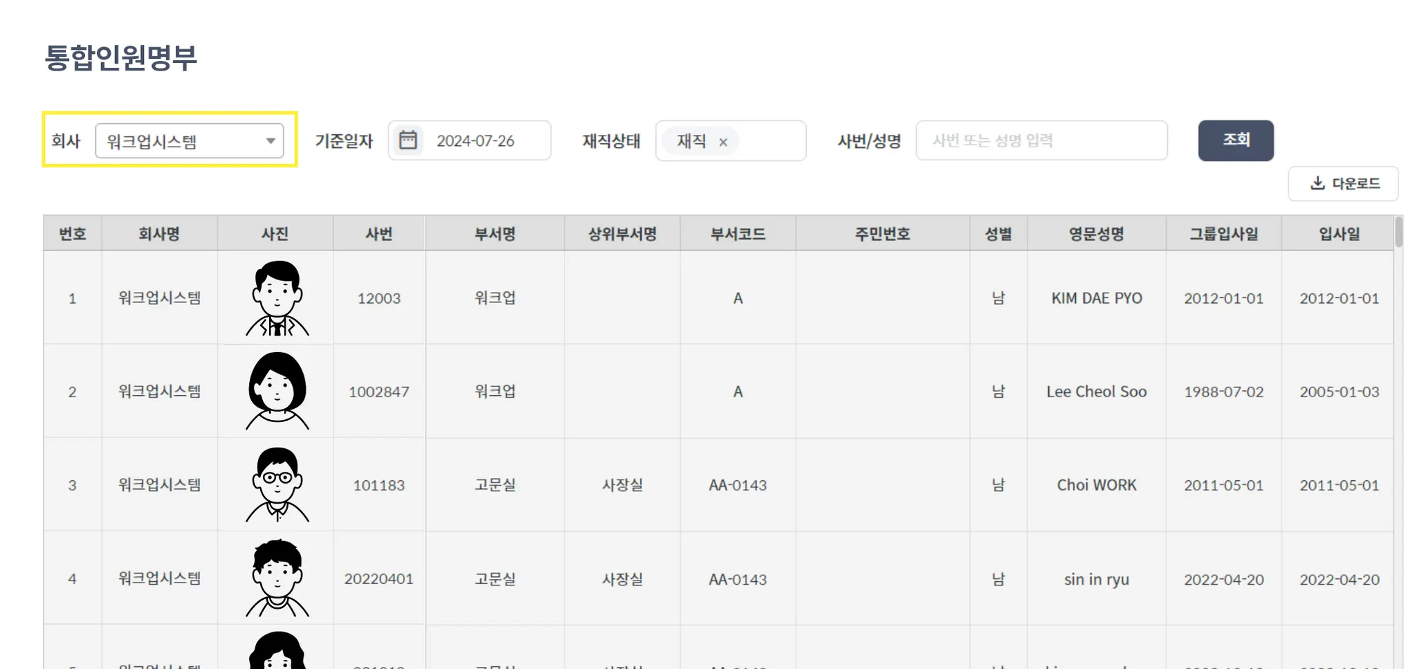 원하는 법인을 선택하여 인원명부를 보는 화면입니다.