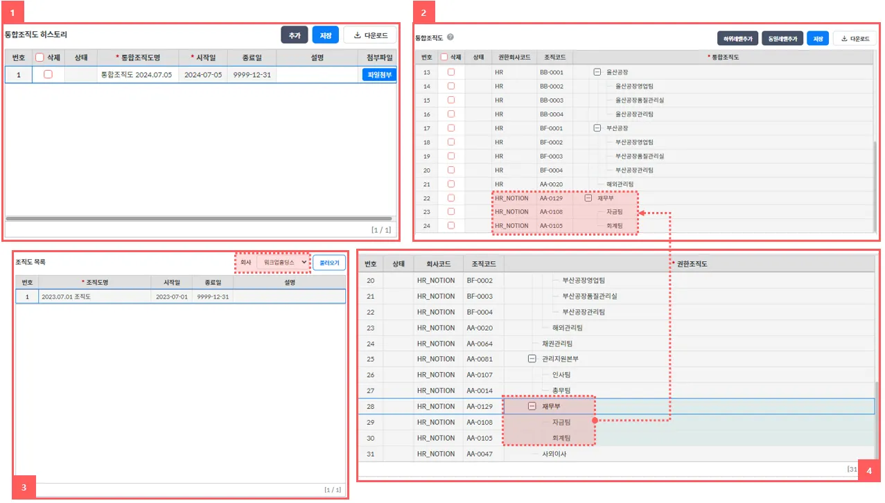 ③ 통합조직도에 불러올 다른 법인과 해당 법인에 조직도를 선택하고 불러오기
