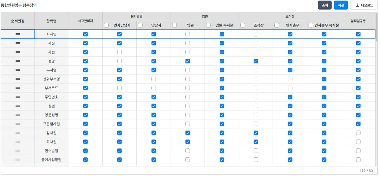 통합인원명부에서 조회할 항목들을 설정하는 화면입니다.