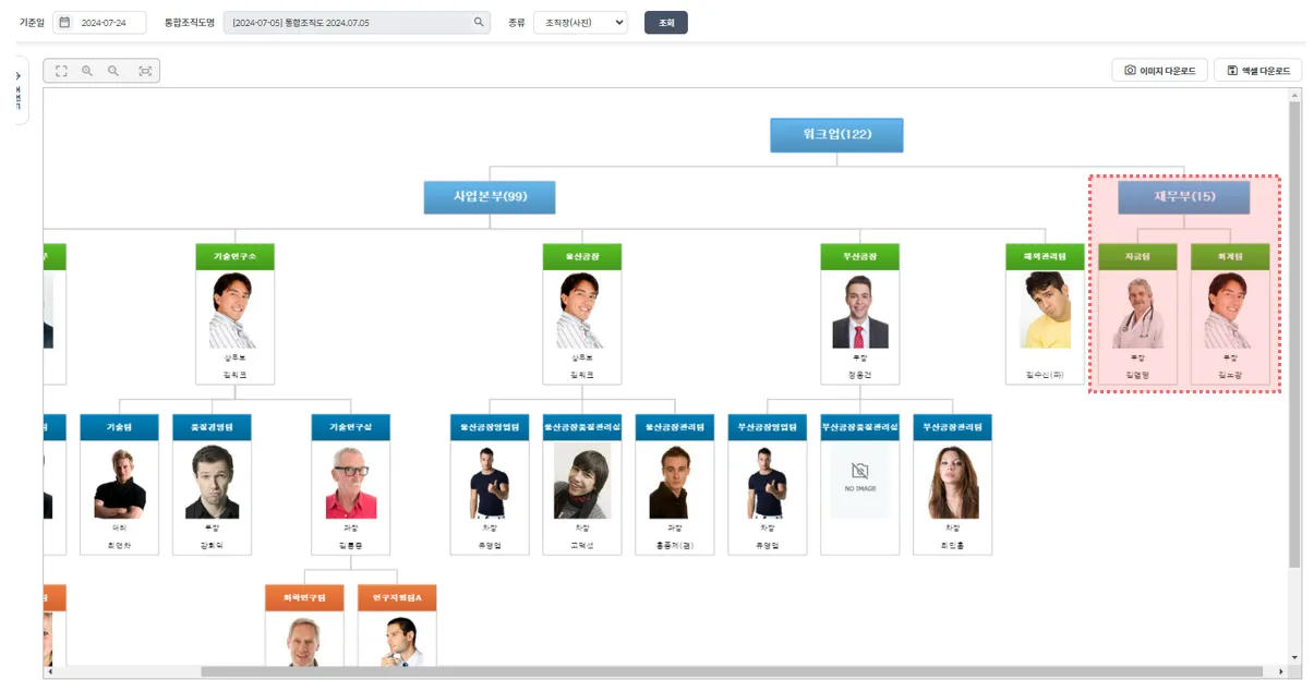 통합조직도에서 등록한 내용을 화상조직도로 조회하는 화면입니다.