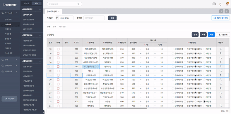 회사에서 관리하는 각종 수당, 공제를 구성하고 각 수당의 상세 요건 및 계산식등을 구성할 수 있습니다.
