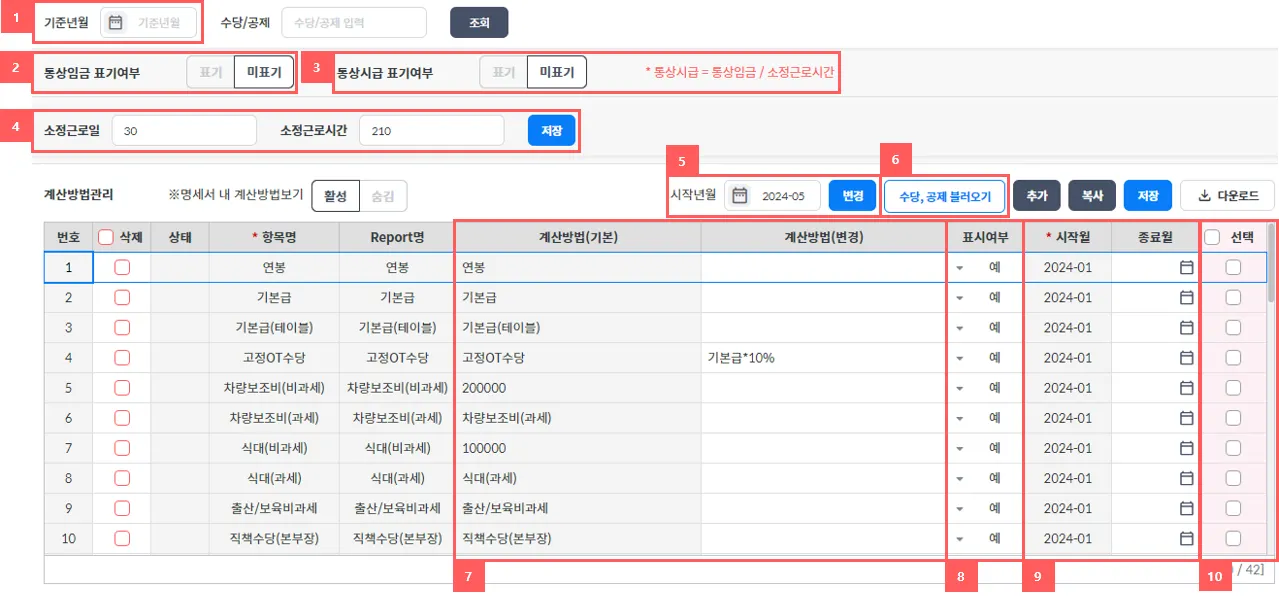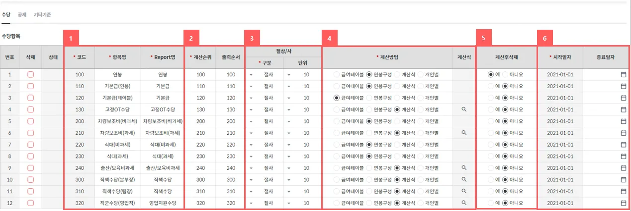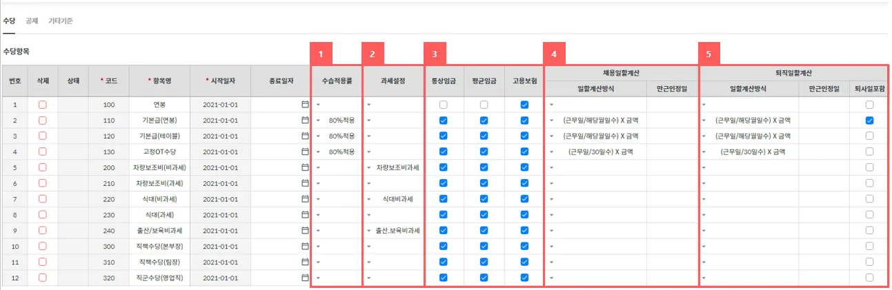 급여를 구성하는 수당, 공제, 기타기준등 기본 항목들을 관리하는 화면입니다.