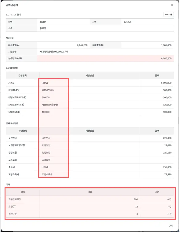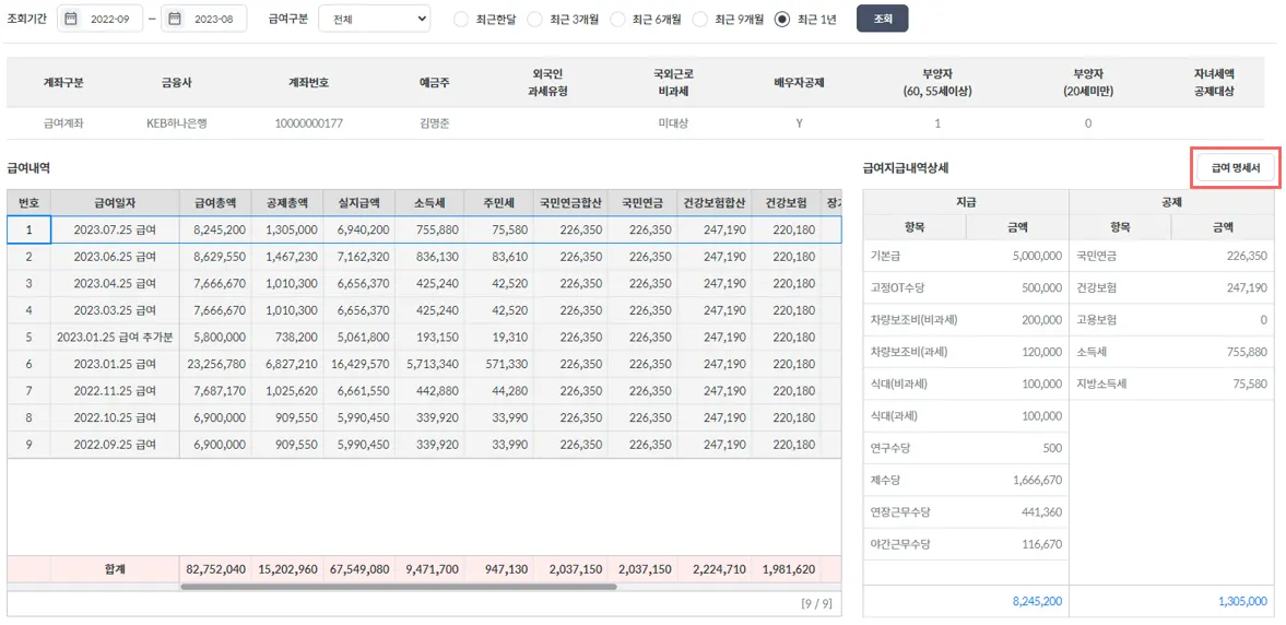 임직원들이 본인의 급여내역을 확인하는 화면입니다.