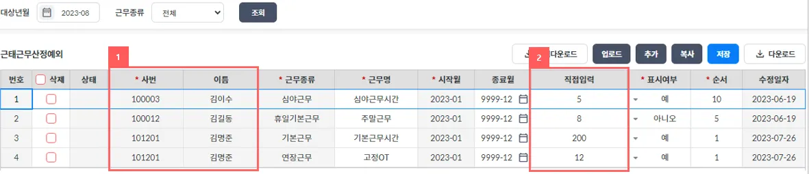 개별적으로 근무내역을 별도 표기할 인원들에 대해 관리하는 화면입니다.