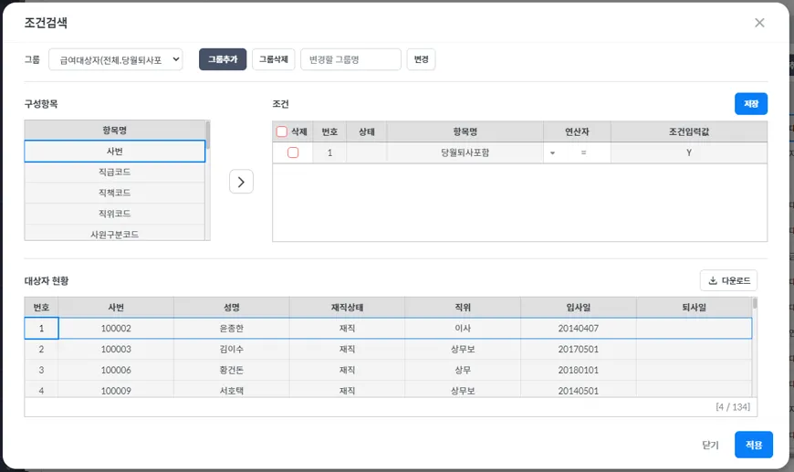 해당 급여코드(종류)에 포함될 급여대상자를 설정하는 화면으로 계산식 대상자 그룹 설정과 동일합니다.