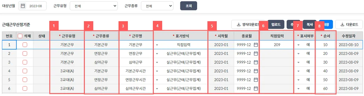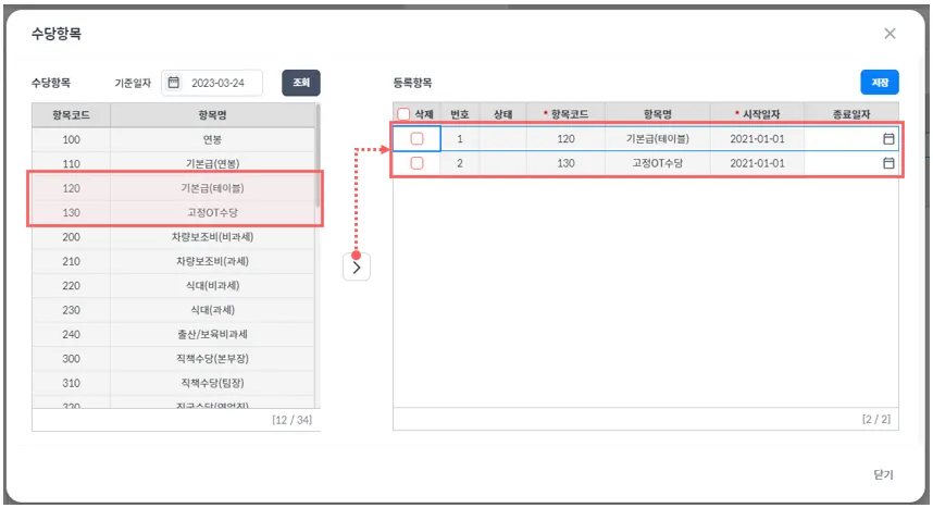 ⑥ 해당 수당코드에 시작, 종료일자를 기입 (같은 항목코드의 경우 겹치는 일자가 존재하지 않도록 유의)