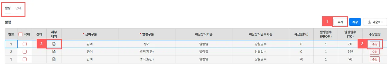 근태 탭도 같은 방식으로 구성되며 발령처럼 지급율에 대한 근태를 등록하여 사용하면 됩니다.