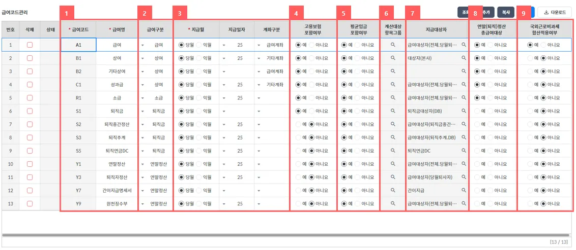1) 통상임금, 고용보험 여부가 체크되어있는 수당들의 집합을 하나의 묶음으로 사용할 수 있거나