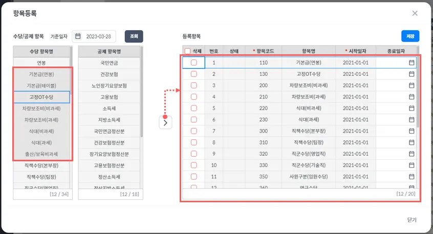 해당 급여코드(종류)에 포함될 수당과 공제항목들을 선택 후 등록하는 화면입니다.