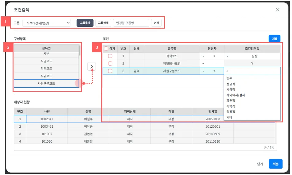 ① 지급대상자를 선택하거나 원하는 기준에 대상자 요건을 추가하는 팝업 호출
