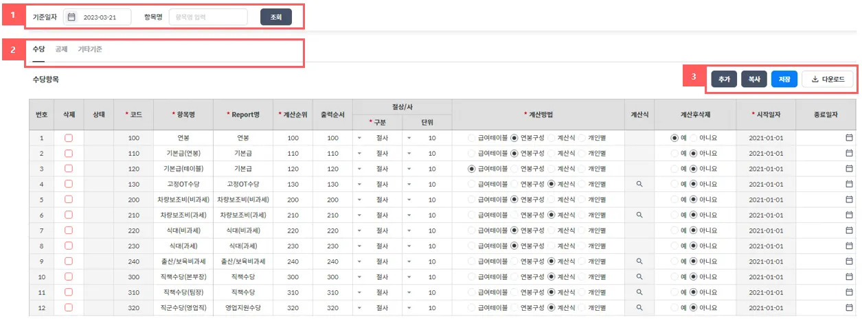 ① 기준일자와 명칭을 토대로 수당 및 공제 검색
