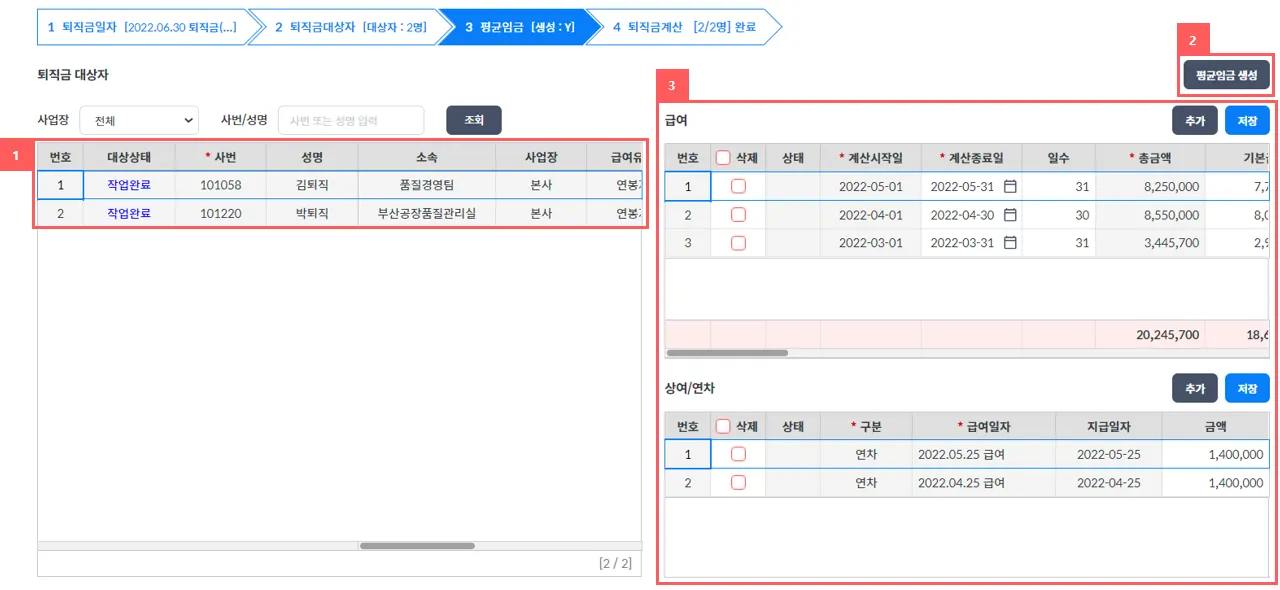 퇴직금 대상자들의 평균임금을 생성하고 수정하는 화면입니다.