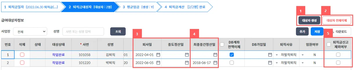 ④ 중간지급, 최종근속연수에 대한 입사일, 기산일, 퇴사일등을 등록