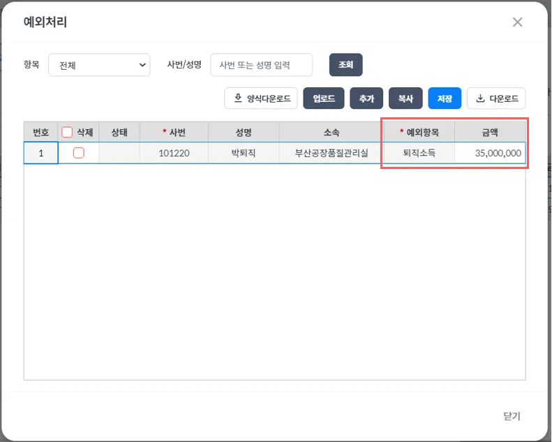 기지급된 퇴직소득 내역을 예외처리하여 이관 작업 위한 방법으로 귀속년도 국세청 신고시 필요한 데이터를 생성하는 작업입니다.