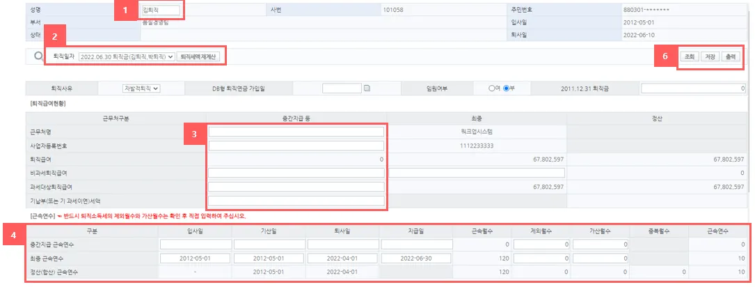 ④ 이미 과거에 중도정산을 받았다면 해당 일자 등록 (등록된 일자에 다음날이 퇴직기산일)