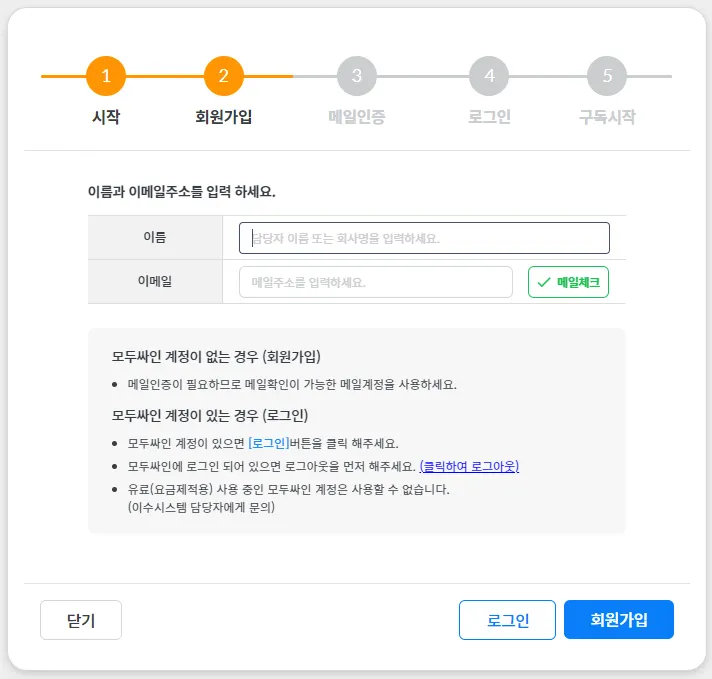이름, 이메일 등록과 인증을 통해 계정 가입 및 구독을 시작하면 됩니다.