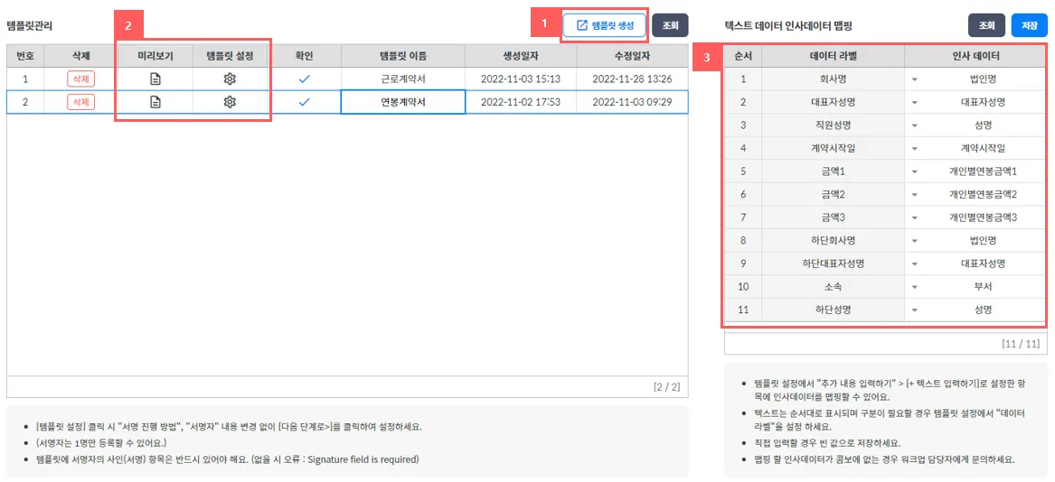 계약서 템플릿 등록 및 데이터 맵핑을 하는 화면입니다.