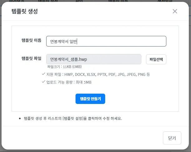 업로드할 계약서 양식을 템플릿 형태로 등록하는 화면입니다.