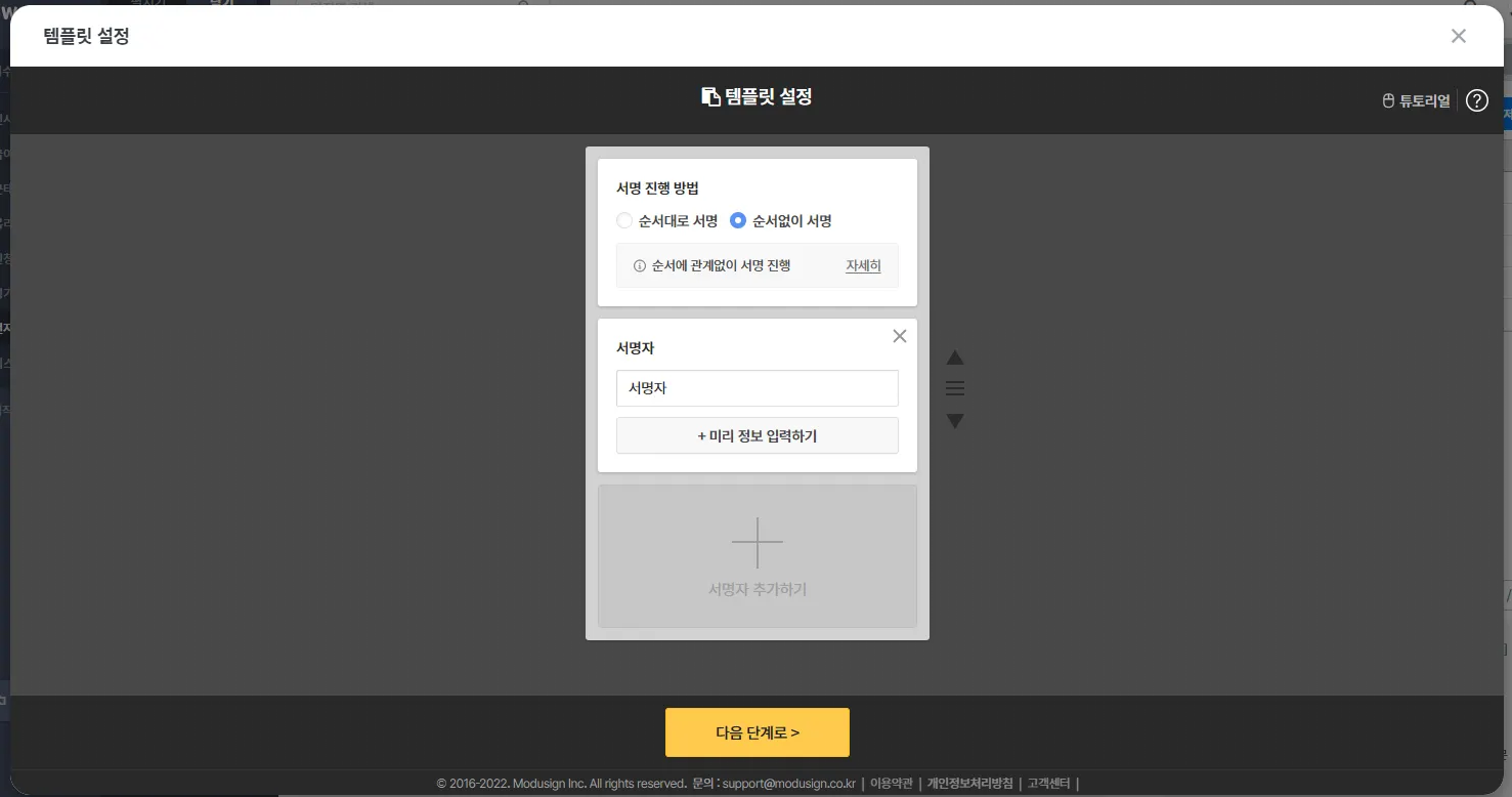 템플릿 만들기를 누르면 나오는 첫 화면으로 서명순서가 없다면 바로 다음단계로 클릭하여 진행합니다.