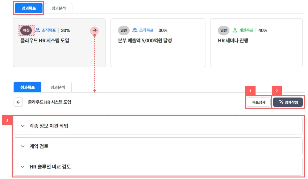 등록한 목표에 대해 성과를 작성하고 관리하는 화면입니다.