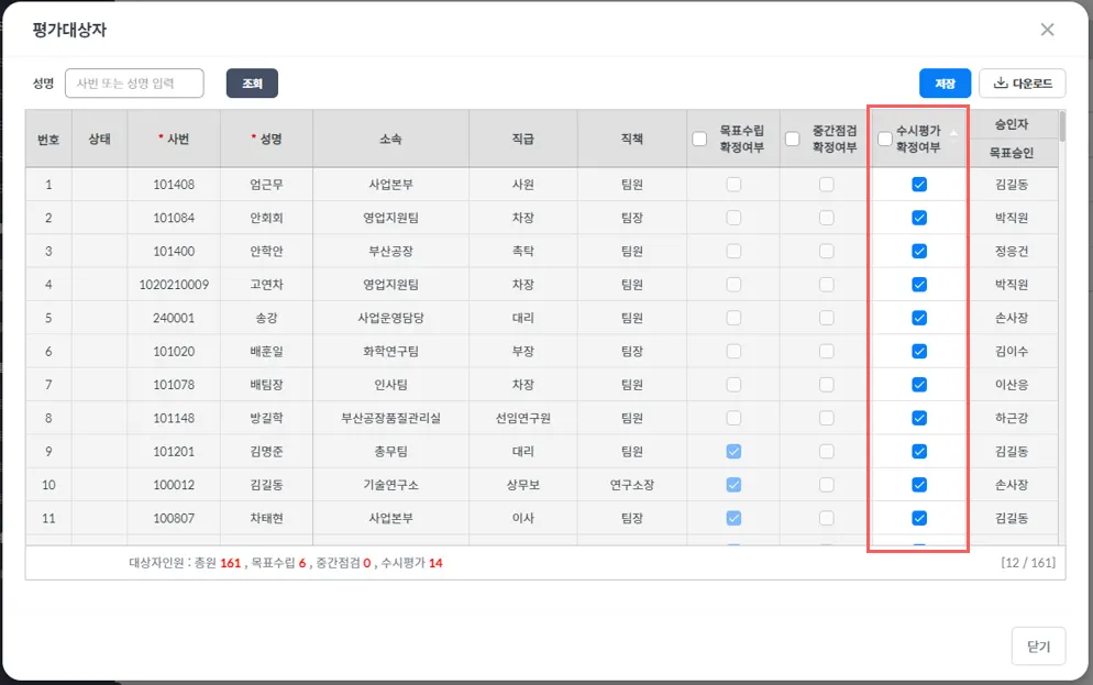 목표등록한 대상자들을 확인하며 수시평가를 진행할 대상자를 선택하는 화면입니다.