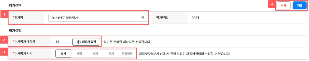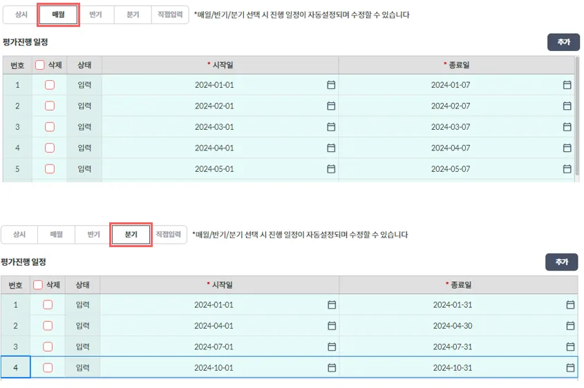 수시평가 시기를 상시, 매월, 반기, 분기, 직접입력으로 직접 구성할 수 있는 화면입니다.