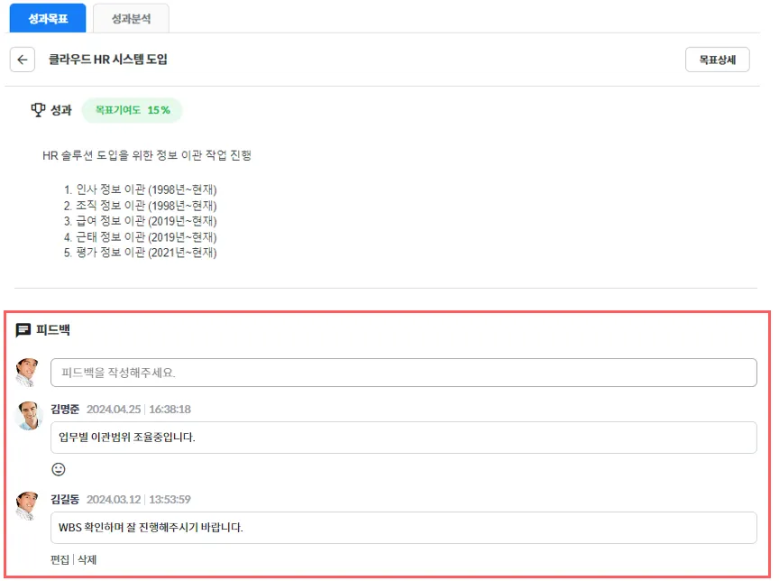 등록한 성과 내용에 대해 본인과 승인자간 피드백을 주고받는 화면입니다.