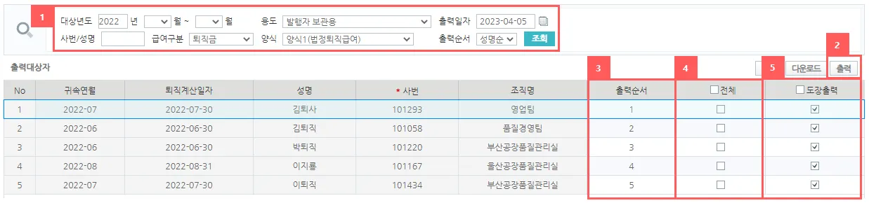 계산된 퇴직금 내역을 대장 혹은 퇴직소득원천징수증 형태로 출력 할 수 있습니다.